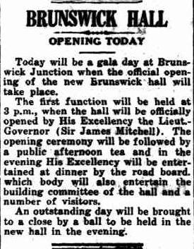 The prominent architectural firm Cameron Powell & Chisholm and local builder, Mr Joseph Johnson, constructed the current Brunswick Memorial Hall. A portion of the original hall, including the main entrance, was retained. Sir James Mitchell opened it on 15 July 1936.