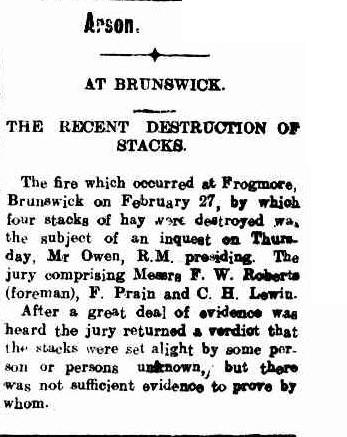 In 1913, three haystacks were deliberately set alight in the middle of the night. The flames rose quickly, visible from both houses on the property. An inquest found the stacks had been set on fire by “persons unknown.” The loss was significant, and suspicion lingered in the district.