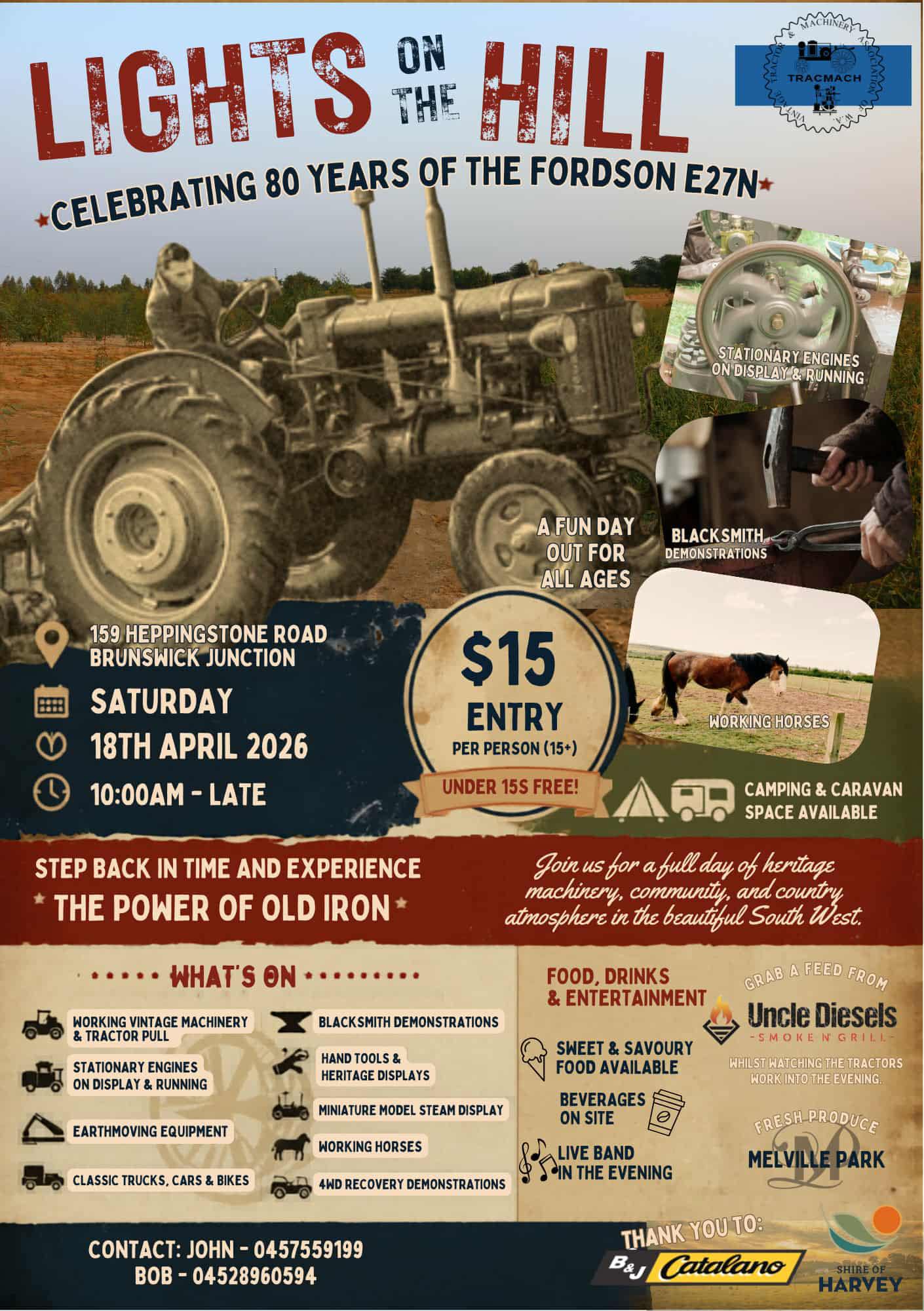 The annual Lights on the Hill is the biggest static and working display of vintage farm machinery, trucks, cars and stationary engines in Western Australia.